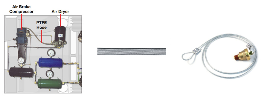 Il sistema del compressore è costituito da tre componenti: il compressore, l'asciugatrice e il tubo di collegamento o il tubo. Il flusso d'aria generato dal compressore non può essere utilizzato fino a quando non è condizionato. Ci sono due problemi con l'aria compressa grezza. Innanzitutto, l'aria proveniente dal compressore è troppo calda per i tubi standard. Il tubo PTFE viene utilizzato per collegare il compressore all'asciugatrice perché può gestire temperature fino a 400 ° F. Il tubo PTFE può essere identificato dalla treccia in acciaio inossidabile che funge sia da copertura che da rinforzo.